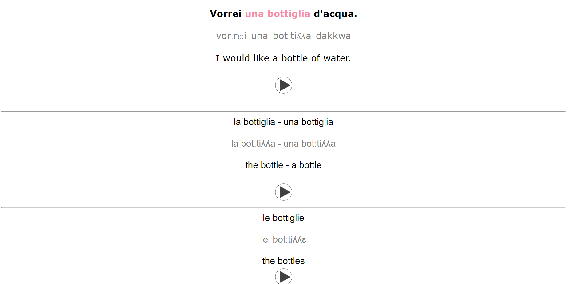 You will also see just the Italian word, the IPA notation of the word, the English translation of the word, and an audio file of the Italian word.